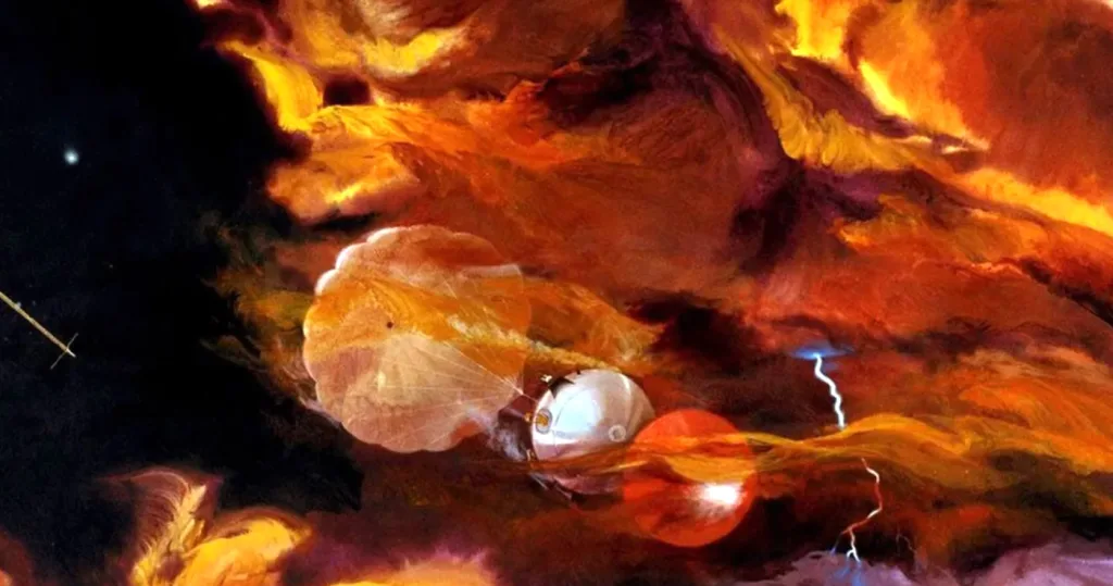 După ce frânarea aerodinamică i-a redus viteza amețitoare, sonda în formă de wok și-a deschis parașuta și a început să transmită. Timp de 58 de minute, a plutit aproximativ 200 de kilometri prin straturile de nori, măsurând totul: presiune, temperatură, vânturi, fulgere și compoziția chimică a unei lumi extraterestre.