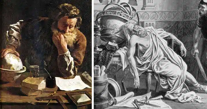 Conform descrierii lui Plutarh, Arhimede își contempla o diagramă matematică atunci când orașul a fost capturat. Un soldat roman i-a ordonat atunci să meargă să-l întâlnească pe generalul Marcellus, dar Arhimede nu a vrut, spunându-i că are de terminat o problemă. Soldatul s-a înfuriat și l-ar fi ucis cu sabia sa.