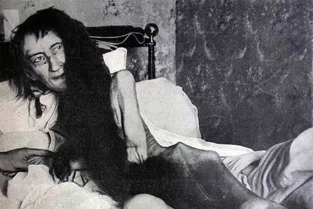 De pe un pat plin de resturi de mâncare şi excremente a scâncit, la vederea luminii, o creatură monstruoasă, numai piele şi os.