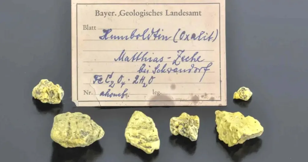 Pe hârtia îngălbenită de timp scria: „Humboldtină din mina Mathias, lângă Schwandorf.” Pentru majoritatea, aceste cuvinte nu însemnau nimic. Dar pentru Roland Eichhorn și echipa sa de la Oficiul Bavarez pentru Mediu, a fost ca un șoc electric. Știau că humboldtina este un mineral de o raritate extremă. Oare era posibil?