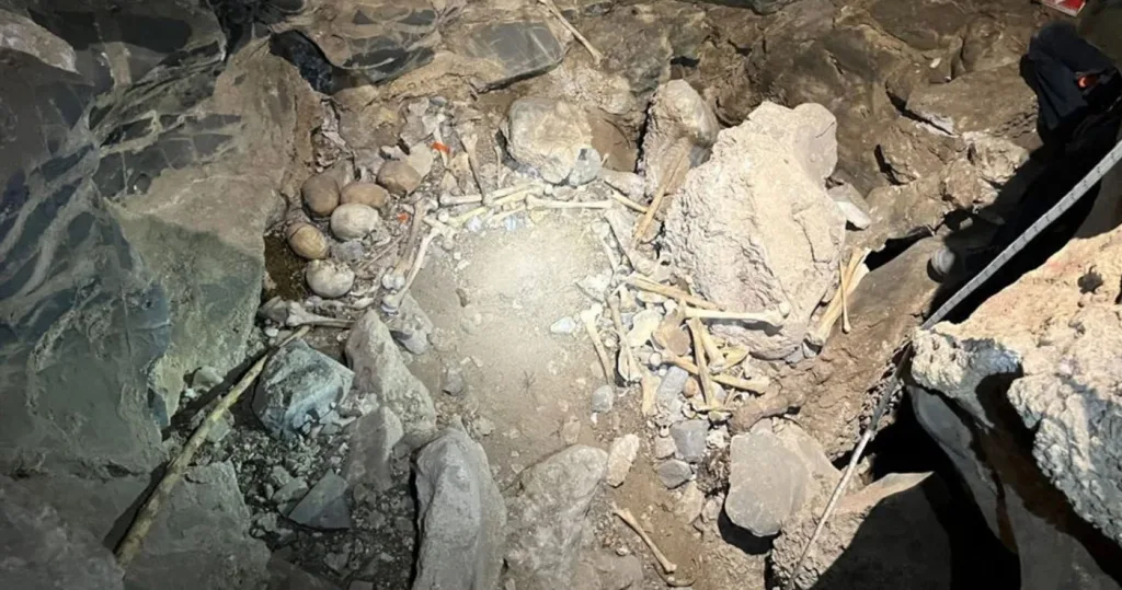 După o cercetare minuțioasă a terenului accidentat, arheologii au dat peste detaliul care schimba totul: o crăpătură verticală, un puț îngust de numai 50 de centimetri lățime. Părea o simplă fisură în stâncă, dar era, de fapt, intrarea într-un sistem de peșteri folosit ca loc de veci. La capătul puțului se afla o cameră funerară semicirculară, un sanctuar tăcut ce adăpostea rămășițele a nu mai puțin de 17 persoane.
