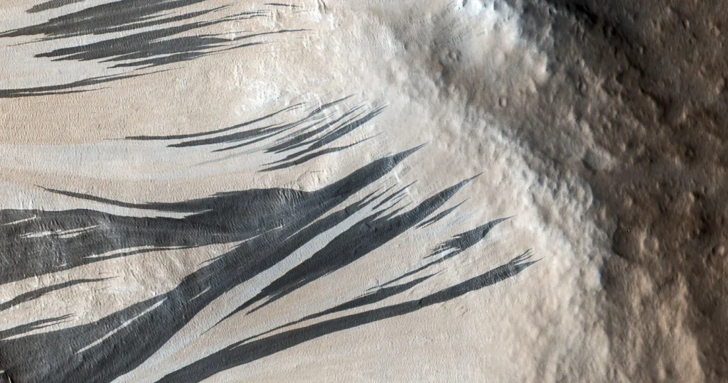 - Teren instabil: Se concentrează în jurul craterelor de impact recente, unde solul este afânat și predispus la alunecări. Un crater proaspăt, de 140 de metri, format acum câțiva ani, este înconjurat de astfel de dungi;