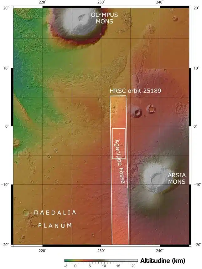 Cel mai apropiat dintre aceștia de Aganippe Fossa este Asia Mons, care are o înălțime de aproximativ 9 kilometri. Mai la nord se află impozanta siluetă a lui Olympus Mons, cel mai înalt vulcan din Sistemul Solar, cu o altitudine de aproximativ 25 de kilometri. Într-o altă descoperire uimitoare, a fost descoperită gheaţă pe aceşti vulcani uriaşi de pe Planeta Roşie.