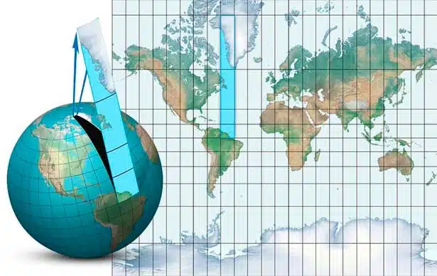 În cazul hărților cilindrice, cum este cazul proiecției Mercator, zonele din jurul ecuatorului rămân aproximativ exacte, dar cu cât vă îndepărtați mai mult de ecuator, cu atât mai distorsionate și mai umflate devin masele terestre.