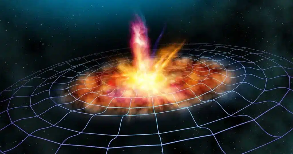 Aici intră în scenă undele gravitaționale. Accelerația puternică provocată de interacțiunea gravitațională a celor două obiecte extrem de dense produce unde gravitaționale care transportă energie. Acest proces eliberează atât de multă energie încât putem detecta apariția sa la miliarde de ani lumină distanță. Această energie trebuie să provină de undeva, și anume de pe orbita reciprocă a stelelor neutronice. În consecință, orbita se dezintegrează, perechea de stele neutronice intrând în spirală spre interior până când se ciocnesc, producând o kilonovă și, odată cu ea, toate elementele din procesul R.