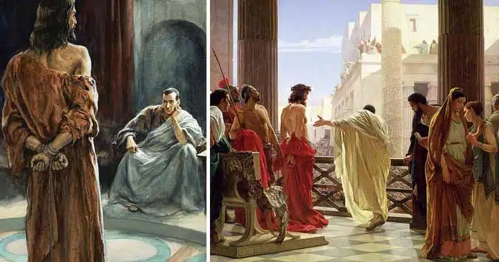 Ponţiu Pilat L-a interogat pe Iisus și nu i-a găsit nicio vină care să justifice pedeapsa cu moartea. Într-una dintre relatări, în special în Evanghelia după Ioan, Pilat a încearcat să-L elibereze pe Iisus, dar autoritățile iudaice insistă că El a încălcat legea iudaică și că, prin proclamarea Sa ca rege, reprezenta o amenințare la adresa Romei.