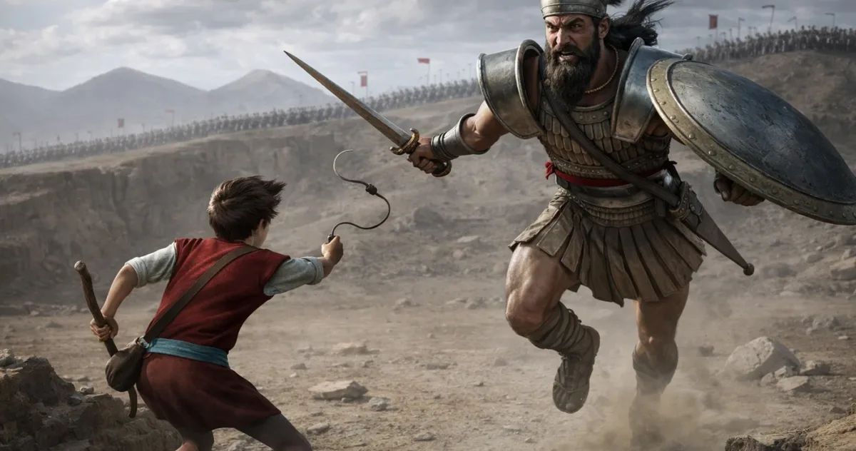 Curând după această ascensiune la curte, se contura o bătălie crucială cu filistenii. De această dată, inamicii au adus pe câmpul de luptă o nouă armă înfricoșătoare: un uriaș pe nume Goliat, care purta o suliță uriașă de bronz (1 Samuel 17:5-7). În timp ce trupele israelite erau paralizate de frică, tânărul David a rămas neclintit. Înarmat doar cu o praștie, el a luat o piatră din albia râului și a aruncat-o direct spre capul lui Goliat. Ținta lui David a fost precisă; piatra l-a lovit pe uriaș și l-a ucis, determinând o retragere haotică a trupelor filistene. Israeliții erau în extaz, iar Saul s-a văzut nevoit să-l pună pe tânărul David în fruntea armatei sale (I Samuel 18:5).