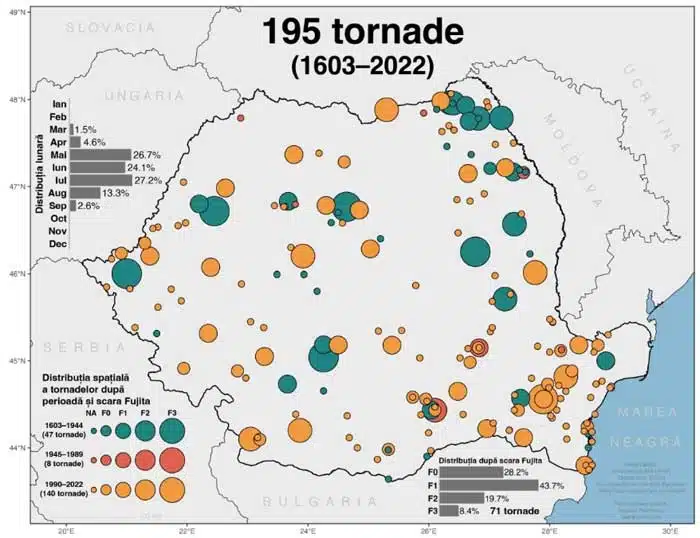 - Distribuția spațială a tornadelor în România arată o frecvență mai mare în estul țării, cu un maxim în sud-est. Majoritatea tornadelor apar între lunile mai și iulie, fiind mai frecvente între orele 09:00 și 20:59, cu un vârf de activitate în jurul orelor 15:00 și 17:00.
