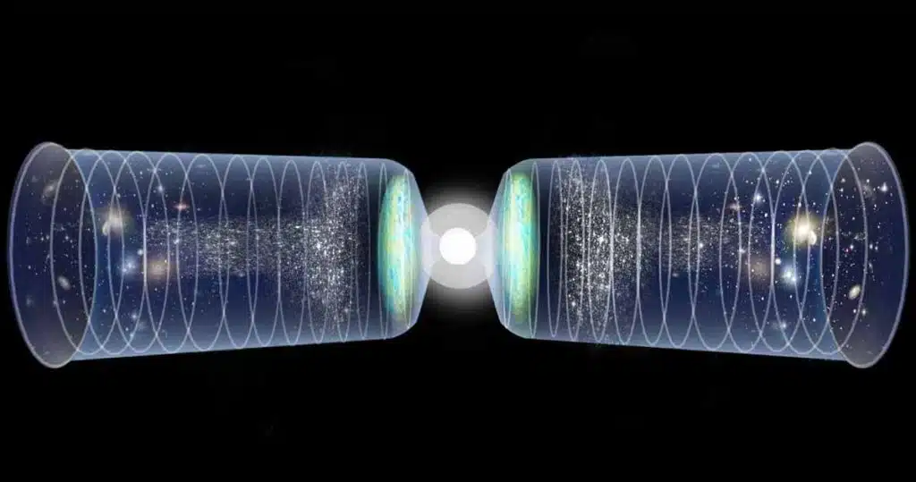 Potrivit acestei teorii, cele două universuri au pornit din același punct, Big Bang, care este centrul dominat de haos și entropie. Pe măsură ce universurile se extind, entropia scade și universurile devin mai structurate și mai ordonate. Acest fenomen este numit „săgeata timpului”, o noțiune introdusă în anul 1927 de astronomul și filosoful Sir Arthur Eddington. Săgeata timpului explică de ce timpul curge într-un singur sens pentru noi, de la trecut spre viitor, și de ce observăm efecte ireversibile, cum ar fi îmbătrânirea sau spargerea unui pahar.